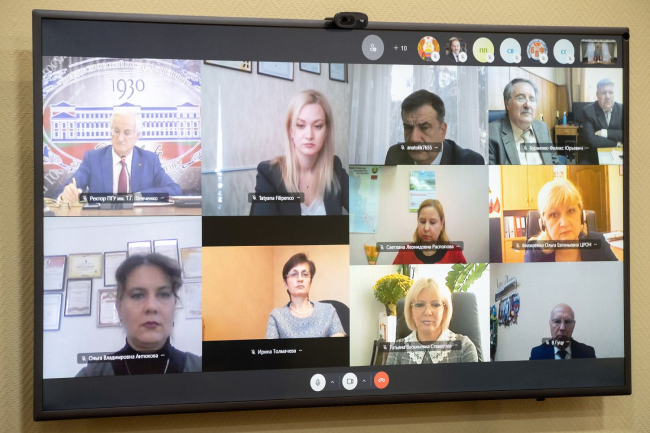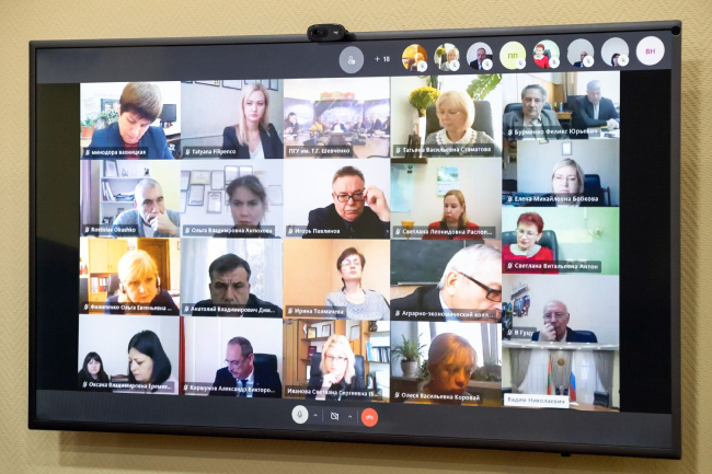 21 Oct, 2021, 13:56Vadim Krasnoselsky held a videoconference with representatives of Pridnestrovian State University named after T. G. Shevchenko. The leadership and administration of the university, members of the Academic Council, deans, heads of departments and research laboratories – about forty people in total – were invited to the conversation. The Head of the Administration of the PMR President, the Head of the Government and the Speaker of the Parliament joined the discussion from the side of the authorities. Rector of the Pridnestrovian State University was a moderator. The purpose of the meeting was to discuss topical issues of life and development of the state university, as well as issues related to education, upbringing, research practice.