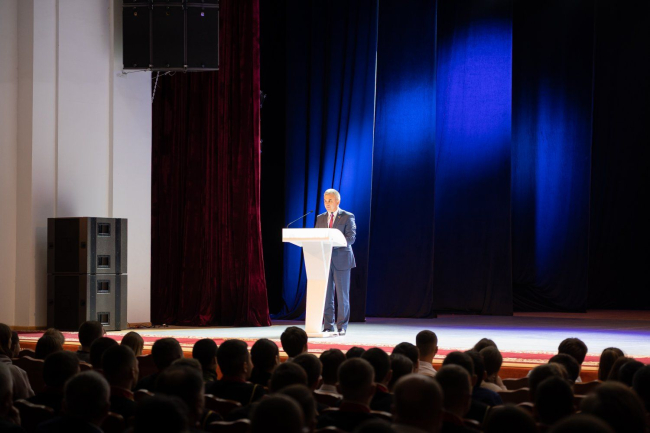01 Dec., 2023, 15:49The “Dialogue on Equals” educational project was launched in Pridnestrovie. The Initiator was the PMR Ministry of Education. The essence is to conduct model lessons for a large school and student audience by public and administrative authorities. Subjects, topics and lesson formats are expected to be different. The choice is up to the lecturers. A prerequisite is to link the topic to the republic and the Pridnestrovian people. The series of lectures was opened by the President of the Pridnestrovian Moldavian Republic Vadim Krasnoselsky. He acted as a teacher of national history today. The topic of his open lesson is “Historical and legal foundations for the international recognition of Pridnestrovie”. More than six hundred students of grades 9-11 from schools of the republic, pupils of Suvorov Military College, cadets, students of secondary vocational education institutions and Pridnestrovian State University, cadets of Tiraspol Juridical Institute gathered to listen to the lecture in the large hall of the Palace of the Republic. There are many officials - those who will be involved in this general education project among the listeners.