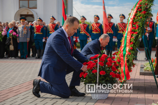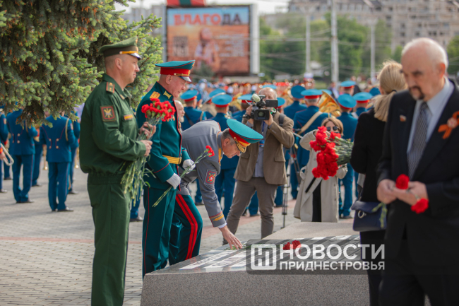 Official celebrations dedicated to the 79th anniversary of the Victory of the Soviet people in the Great Patriotic War of 1941-1945 were opened by a traditional ceremony at the capital's Memorial of Glory. The leadership of the republic and the city, headed by the PMR President Vadim Krasnoselsky, walked from the building in which the legislative and executive authorities are located to the T-34-85 tank. The combat vehicle that towers over the memorial walked the military paths of the Great Patriotic War as part of the 7th Guards Mechanized Corps, liberating Moldova, Ukraine, Bulgaria and Hungary. It was shot down near Lake Balaton in the Budapest offensive operation. The commander, 20-year-old Boris Sergeev, died heroically on January 22, 1945 in Hungary. Junior lieutenant Sergeev was buried in a mass grave in Tiraspol at the insistence of the father, who personally found the body of his son and his comrade. The tank arrived in the city in April 1945. The monument under it, a capsule with soil brought from Mamayev Kurgan (Volgograd) was laid in 1968. Memorial complex was opened four years later, the T-34 became a significant component of which. The Eternal Flame was lit on February 23, 1972, at the Tomb of the Unknown Soldier, to which Pridnestrovians bring flowers. The President of the Pridnestrovian Moldavian Republic Vadim Krasnoselsky on behalf of the entire Pridnestrovian people after the traditional minute of silence laid a wreath of flowers to the undying symbol of eternal gratitude and inexhaustible memory today. A scattering of fresh flowers decorated and warmed the stone slabs with the names of the defenders who in different years gave their lives for peace on Pridnestrovians soil, as well as the pedestals of the monuments of the Tiraspol Memorial of Glory.