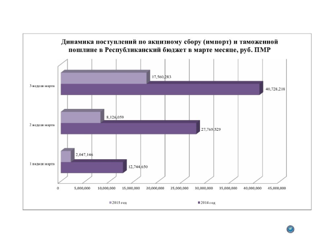 Это находит свое отражение в динамике поступлений в республиканский бюджет средств по акцизным (импортным) сборам, таможенным пошлинам и налоговым платежам (сравнительный анализ поступлений средств в марте 2015 года по отношению к аналогичному периоду 2014 года представлен на графиках).