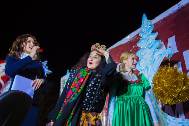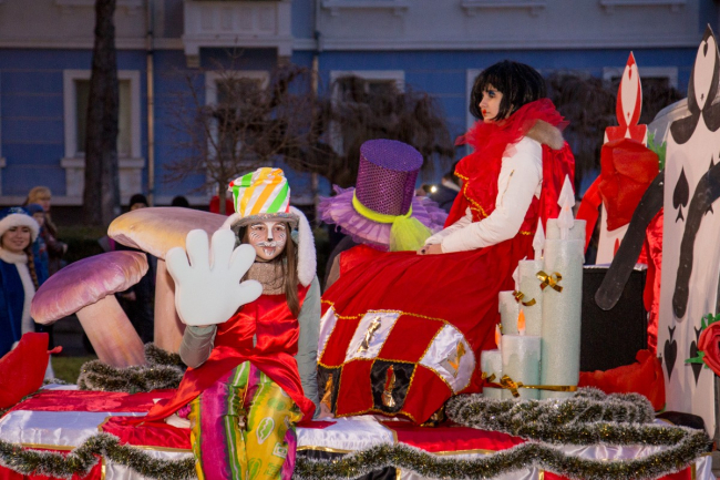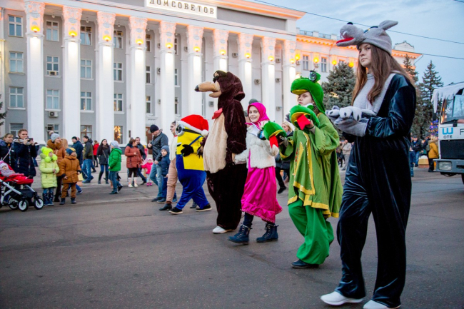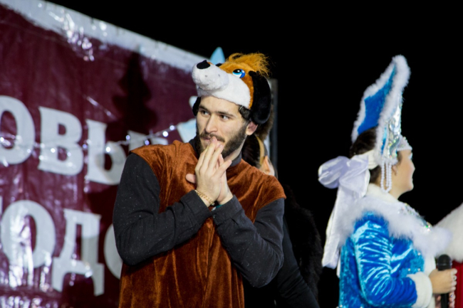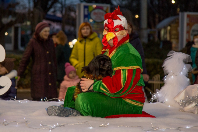 Пока шествие двигалось к площади, на ней проходил театрализованный концерт. Главную сказочную красавицу Василису похитил Кощей Бессмертный. Операция по её освобождению прошла успешно, так как за неё взялся русский Богатырь с символом будущего года – Собакой. Вместе с Дедом Морозом и Снегурочкой они дружно зажгли главную ёлку республики.