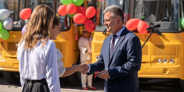 The President handed the buses keys to the Heads of administrations, principals and students of rural schools 01 Sep, 2021, 11:43 Society Президент Транспорт