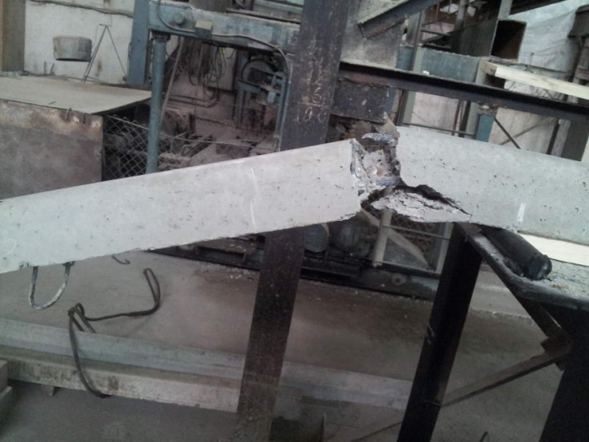 Результаты испытаний оказались интересными. Так, к примеру, первым испытывался столб, изготовленный на ЖБИ-7, размером 85х85х4800 см. Разлом столба у основания (60 см глубина закапывания в землю) произошел при нагрузке 176,64 кг.
