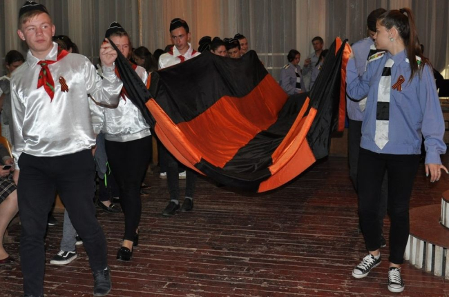 В ходе мероприятия учащиеся местных школ вручали георгиевские ленточки