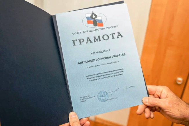 Главе Союза журналистов ПМР Александру Карасёву вручили грамоту от российских коллег
