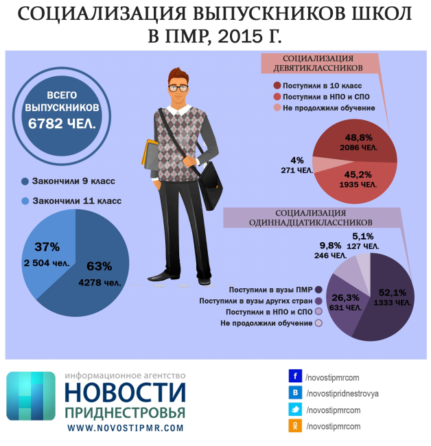 Тем временем, выпускники 11 классов (2504 человек) в большинстве (78,4%) предпочли поступить в вузы. В институты высшего образования ПМР пошли учиться 1333 выпускника, а 631 выпускник прошёл в вузы других государств (в основном России – 421 чел.).