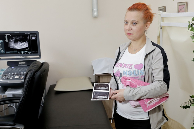С таким же сканером, но с другими насадками вот уже неделю работают в гинекологическом стационаре ЦМиР. Его возможности лучше всего продемонстрировала диагностика одной из пациенток: на 11-й неделе беременности уже видны не только общие контуры будущего малыша, но голова, руки, ноги и то, как бьётся его сердце. Будущей маме даже дали послушать его стук, а затем подарили фотографию на память.