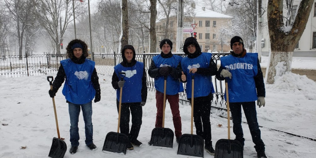 Волонтёры «Мы рядом!» помогают пожилым людям с уборкой снега