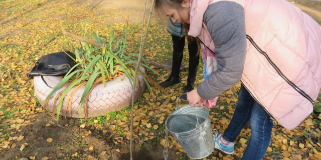 На территории школы ребята совместно с педагогами посадили кустарники сирени и гибискуса, саженцы вишни и яблони
