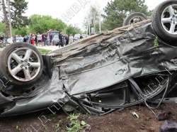 После столкновения двух автомобилей один из них отбросило на тротуар, где находились женщины с колясками