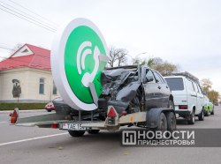 По улицам приднестровских городов курсирует эвакуатор с инсталляцией от ГАИ – автомобиль, который врезался в телефон