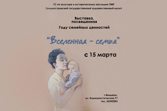 Бендеры, 13 марта. /Новости Приднестровья/. 15 марта в Приднестровском государственном художественном музее в Бендерах откроется художественная выставка «Вселенная – семья». Экспозиция посвящена Году семейных ценностей в Приднестровье. В неё войдут произведения как приднестровских авторов, так и советских художников.