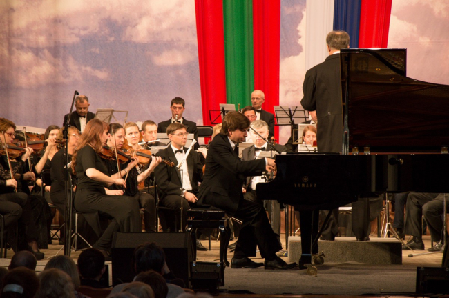 В этот же вечер на большой сцене Дворца республики в совместном концерте выступили симфонический оркестр ПМР и участники Российского музыкального проекта «Посольство мастерства» - Роман Маркелов (саксофон) и Алексей Сычев (фортепиано). Сегодня они играли музыку русских композиторов.