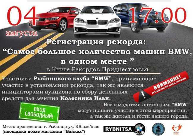 Рыбница, 3 августа. /Новости Приднестровья/. 4 августа в 17:00 в Рыбнице пройдёт благотворительный аукцион по сбору денежных средств для реабилитации 5-летнего Ильи Колесника. Мероприятие проводит рыбницкий клуб BMW, в котором могут принять участие все обладатели автомобиля марки «BMW».