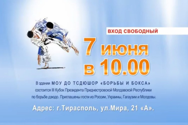 Турнир по борьбе дзюдо на кубок Президента Приднестровской Молдавской Республики пройдёт в Тираспольской школе борьбы и бокса по адресу: ул. Мира, 21 «А». Начало турнира в 10:00, вход свободный.