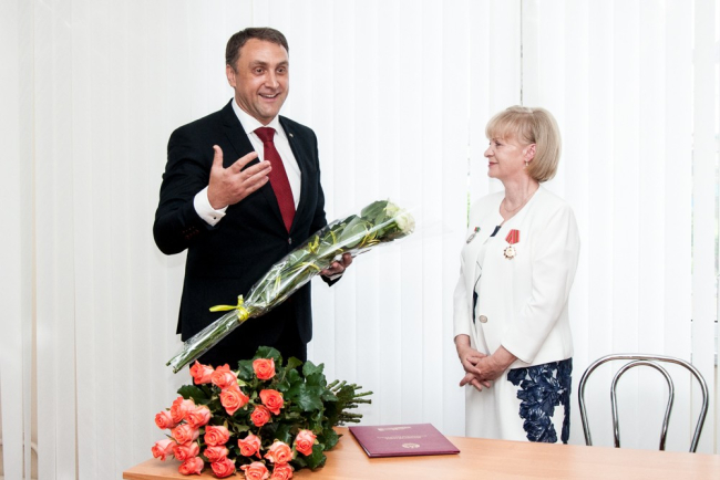 Сегодня коллектив ведомства отметили высокими наградами. Указом Президента ряду сотрудников присвоено почетное звание «Заслуженный работник финансовой системы», вручены госнаграды, грамоты Главы государства. заместитель Председателя Верховного Совета Александр Щерба, поздравивший коллектив Счетной палаты от имени Председателя ВС, вручил сотрудникам ведомства юбилейные медали, выпущенные в честь 25-летия Верховного Совета. Кроме этого, ряду сотрудников вручили юбилейные нагрудные знаки «25 лет финансовой системе ПМР».