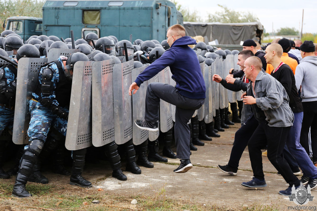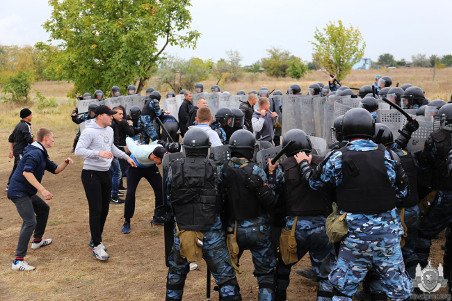 На завершающем этапе бойцы СМВЧ отработали построение «черепаха», применяемое для безопасного подхода к зданию, в котором забаррикадировались «зачинщики беспорядков». Пока две шеренги правоохранителей, накрывшись щитами, держали оборонительные порядки, внутрь строения вошла группа изъятия и через время вывела агрессивных «фанатов».