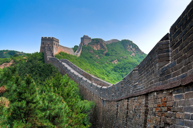 Великая Китайская стена — памятник архитектуры начала III в. до н.э. Стена является одной из самых популярных достопримечательностей Китая, она тянется через горы, реки, ущелья, пустыни и долины, повторяя рельеф местности. Её протяженность составляет почти 9 тысяч км, высота колеблется от 6,6 м до 10 м, ширина в верхней части достигает 5,5 м.