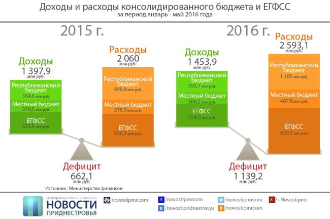 В прошлом году за пять первых месяцев сумма дефицита равнялась 662,1 млн рублей, а уже в 2016 (за январь-май) дефицит увеличился до 1 млрд 139,2 млн рублей. Это связано с ростом расходов государства на выплату задолженностей бюджетникам.