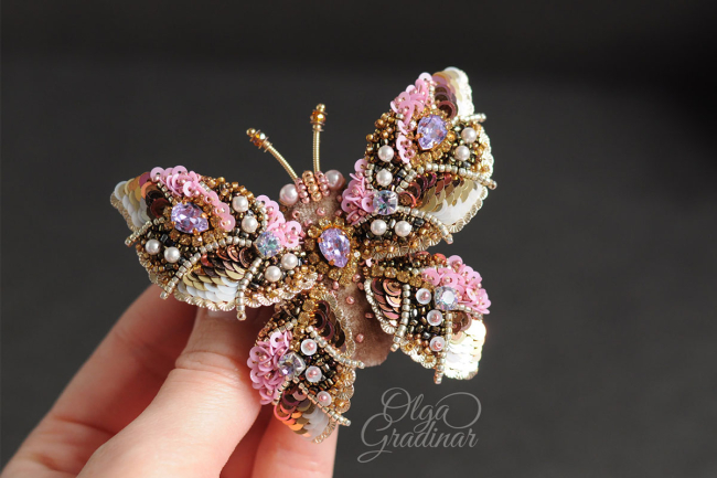 За 4 года Ольга Градинар создала несколько сотен уникальных украшений. Ее визитная карточка - флористические и анималистические мотивы. В изготовлении брошей, серег, нагрудных знаков рукодельница использует только лучшие материалы: французские и итальянские пайетки, кристаллы и жемчуг Сваровски, японский и чешский бисер, шелковый бархат, канитель, хрустальные бусины и натуральный жемчуг.