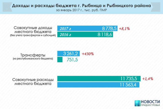 Согласно приведенным данным, республиканские трансферты в бюджет Рыбницы выросли в 4,3 раза в сравнении с январем прошлого года. Они составили 3 млн 261,2 тыс. рублей против 751,5 тыс. в 2016 году.