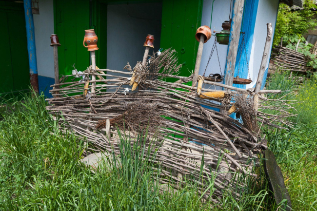Глиняный домик с деревянными ставнями в тенистом дворе словно ожившая сказка. Внутри – традиционная молдавская утварь: печка, глиняная посуда, старинные фотографии, пряжа ручной работы. Что-то досталось от родителей, чем-то поделились неравнодушные соседи. Парадная комната «каса маре» всегда готова к празднику. У стены расположена расписная лавка - старожил дома. Ее собирали в комнате, когда дом строился, и никуда больше не выносили. Еще одна гордость – домотканый ковер, которому почти 120 лет. Традиционные технологии его создания занесены в список объектов всемирного наследия ЮНЕСКО.