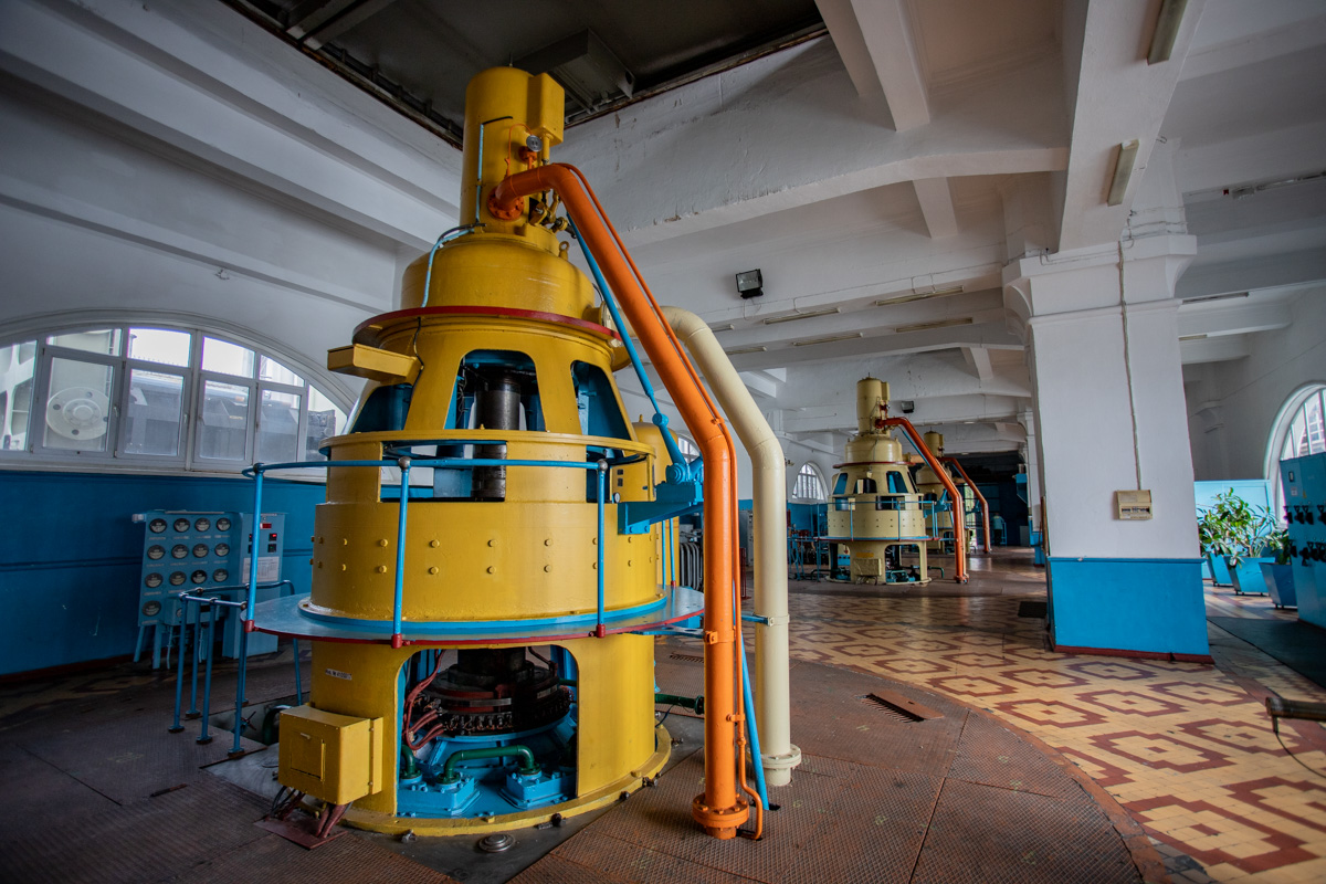 В машинном зале станции располагаются генераторы, которые управляют лопастями и направляющим аппаратом турбины. Как отметил старший дежурный станции, для управления одной турбиной необходимо давление масла 20 атмосфер, создающееся в маслонапорной установке.