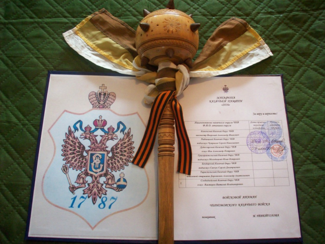 На мемориале Скорбящая мать в присутствии прибывших участников военно-спортивных сборов, кадетов, представителей общественных организаций города и района, горожан и гостей города, атаман дубоссарских казаков есаул Александр Иов передал исторический символ вахты памяти – большую атаманскую булаву - атаману Григориопольского округа Черноморского казачьего войска подъесаулу Илье Молодецкому.