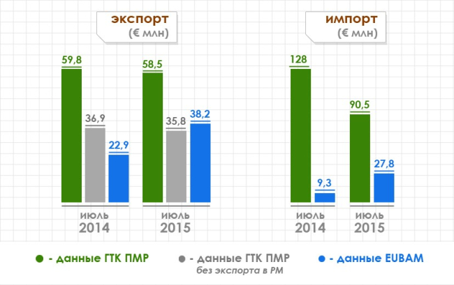 По оценке EUBAM, в июле 2015 года объем приднестровского экспорта вырос к уровню июля прошлого года на 40% и составил €38,2 млн, тогда как реальный показатель экспорта республики за анализируемый период превысил €59 млн ($64 млн) и по сравнению с июлем 2014 года сократился на 2,3%. Если из оценки, подобно экспертам миссии ЕС, исключить торговые операции с Молдовой, то снижение экспорта в анализируемом периоде составило 3%.