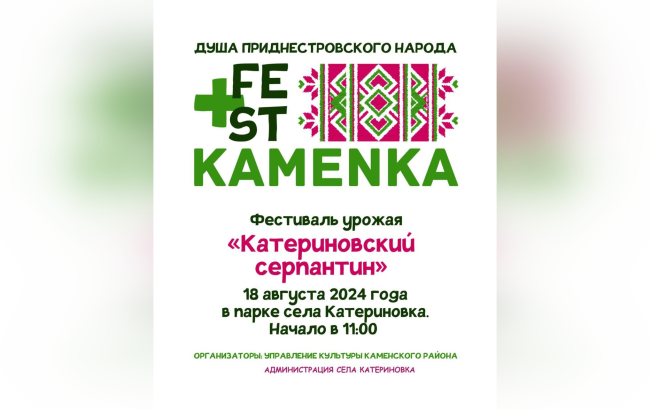 13 Авг.., 2024, 19:32Каменка, 13 августа. /Новости Приднестровья/. Фестиваль урожая «Катериновский серпантин» пройдет в воскресенье, 18 августа, в парке села Катериновка Каменского района.