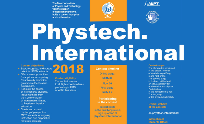 Международную олимпиаду школьников Phystech.International по физике и математике Московский физико-технический институт (государственный университет) проводил при поддержке Федерального агентства по делам Содружества независимых государств, соотечественников, проживающих за рубежом, и по международному гуманитарному сотрудничеству (Россотрудничество).