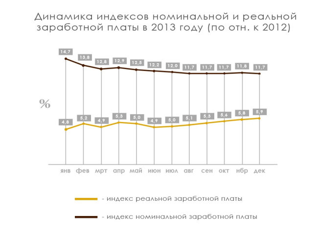 Согласно статданным, в прошлом году размер реальной заработной платы увеличился на 5,9%, при этом рост начисленной заработной платы к концу 2013-го составил 11,7% (Диаграмма 2).