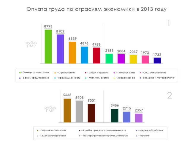 В отраслевом разрезе в 2013 году самые высокие заработные платы (Диаграмма 1 п.1) платили в сфере электро- и радиосвязи, банковском секторе, страховании, промышленности. В пятёрку самых оплачиваемых сфер в прошлом году неожиданно вошла отрасль физкультуры, отдыха и туризма.