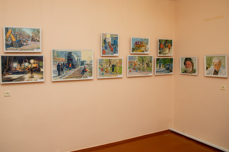 На выставке представлено 37 работ, выполненных маслом. Полотна были созданы в период с 2017-го по 2020 год. В основном на картинах изображена трудовая деятельность людей рабочих профессий: сотрудников дорожной отрасли, электромонтажников, милиционеров и других. Есть и портреты.