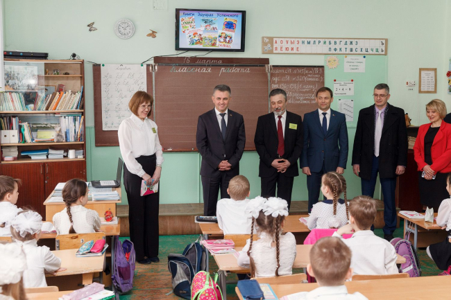 Президент осмотрел классные комнаты, пообщался с первоклашками и выпускниками. Спрашивал о планах на перспективу, нацеливая учеников старших классов планировать будущее без отрыва от родины. Глава государства посетил школьный музей, обратив внимание на значительное количество экспонатов, посвященных Великой Отечественной войне. Президенту рассказали, что патриотизму и сохранению истории в школе уделяют огромное внимание. За каждым классом закреплен ветеран Великой Отечественной войны либо труженик тыла. Ребята ухаживают за Мемориалом Воинской Славы и могилами погибших защитников. О значимости бережного отношения к истории говорится и в записи, оставленной президентом в книге почетных гостей. Вадим Красносельский подчеркнул, что у тех, кто не помнит и не чтит прошлого, нет будущего, и выразил благодарность за похвальное отношение к истории.