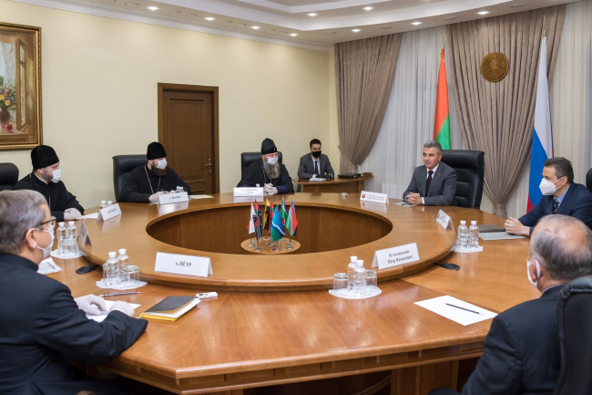 На встрече говорили о перспективах постепенного возобновления служб. Обсудили меры безопасности, которые позволят минимизировать риск распространения вируса среди посетителей церквей.