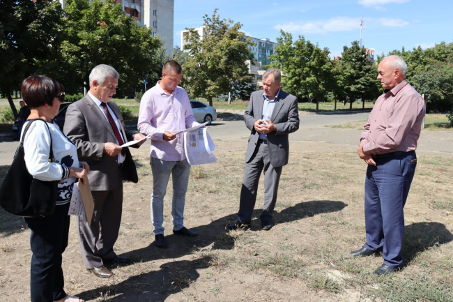 Первым пунктом объезда стал Первомайский парк культуры и отдыха. Сейчас здесь проводятся работы по обустройству дорожки для катания на роликовых коньках. По проекту на этом участке парка должны быть баскетбольная площадка, площадка для настольного тенниса, тренажеров и для игры в гигантские шахматы. Уже есть спортплощадка и волейбольное поле. Подрядчику предстоит также благоустроить территорию вокруг.