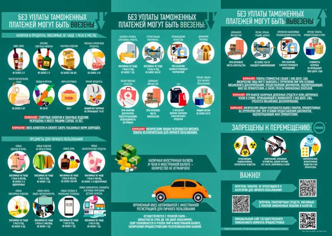 В памятке даются ответы на вопросы о разрешенных нормах беспошлинного ввоза продуктов питания, спиртных напитков, мебели, техники, иных предметов для личного пользования. Буклет поможет разобраться и в правилах ввоза и вывоза валюты, а также временного ввоза автомобилей иностранной регистрации для личного пользования.