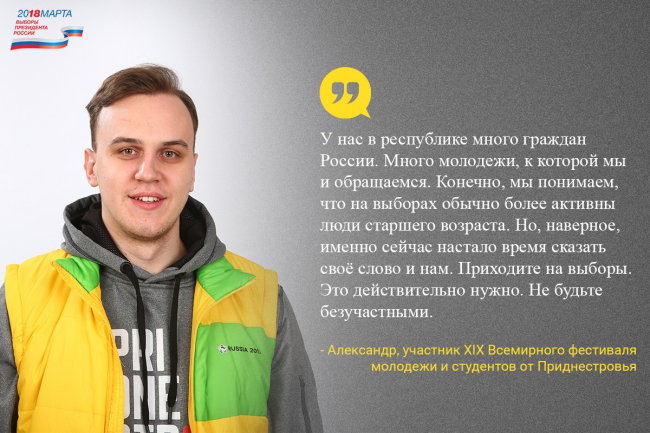 21 Фев.., 2018, 09:0618 марта 2018 г. в Российской Федерации пройдут выборы Президента. В Приднестровье будут открыты 24 избирательных участка. В республике сегодня проживают порядка 220 тысяч граждан РФ. В связи с этим участники XIX Всемирного фестиваля молодежи и студентов от Приднестровья проводят с 20 февраля по 18 марта 2018 г. Республиканскую информационную кампанию «Приднестровье голосует вместе с Россией. Россия в моем сердце!».