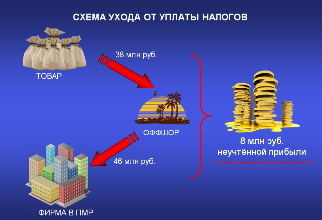 Оффшорная компания, располагавшаяся, скажем, на Виргинских островах, покупает товар за 38 миллионов рублей. В свою очередь предприятие из нашей республики перекупает этот товар уже за 46 миллионов. Все законно, никаких махинаций. Однако на деле, оффшорная организация и приднестровская фирма принадлежат одному человеку, который осуществляет выгодные сделки при минимальных налоговых отчислениях в бюджет.