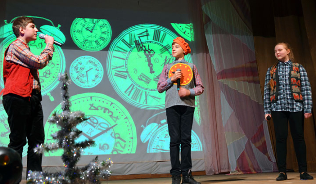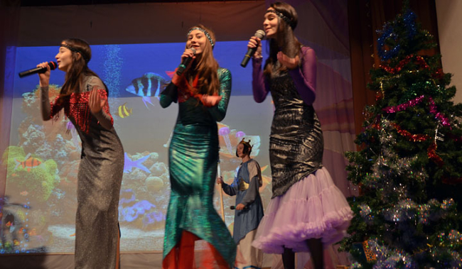 Традиционно к новогоднему торжеству артисты Образцового коллектива театра песни «Овация» под руководством Ольги Дубаевой готовят новые музыкальные сказочные постановки. В этом году главными героями были Новогодний Будильник, царь Нептун с дочерьми-русалочками, фея, а также злые персонажи под руководством Мракопудры.