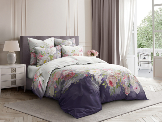 Также в сатиновую коллекцию «Воздух» вошёл актуальный хит летнего сезона - модный оттенок цвета лиловой сирени. Дизайн выполнен в технике градиента и при этом создаёт отличный визуальный акцент мягких тональных переходов в стиле страйп-сатин.