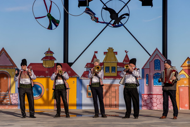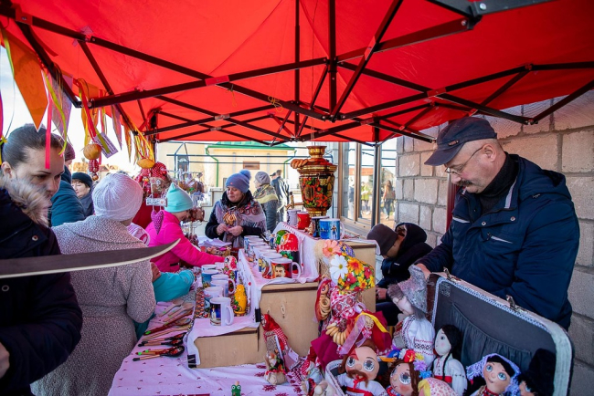 Согласно славянской мифологии блины символизируют Солнце, согревающее землю после холодной зимы. Побаловать себя этим лакомством с разными начинками можно было в импровизированном кафе под открытым небом. Кроме блинов в ассортименте - шашлыки и другие мясные вкусности.