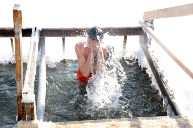 Чтобы избежать рефлекторного сужения сосудов головного мозга, окунаться лучше всего по шею, не намочив голову.