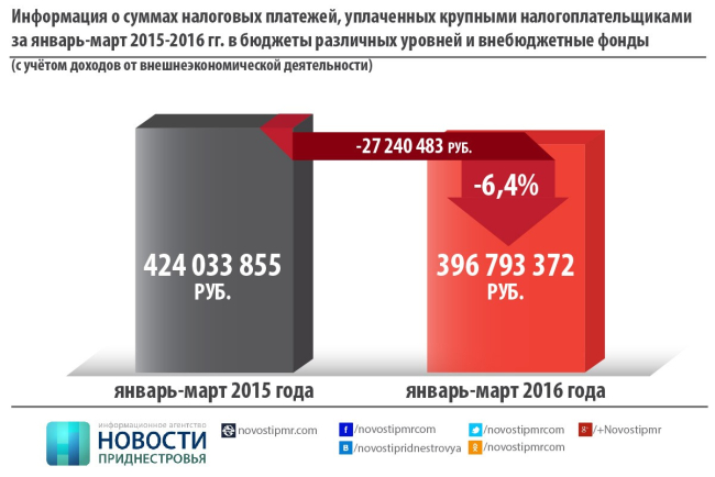 Наибольшее снижение отчислений в госказну допустил ООО «Шериф» - 13,3 млн. ООО "Тираспольтрансгаз-Приднестровье" уплатил налогов на 8 млн. меньше чем за аналогичный период 2015 года. Существенное снижение (около 7 млн. рублей) отмечено у ОАО "ММЗ" + ООО "Тирас Мет".