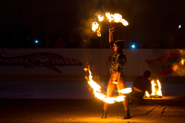 Для зрителей и для самих хоккеистов приятным подарком стало фаер-шоу в конце соревнований, а в перерывах свои номера исполняли приднестровские фигуристы.