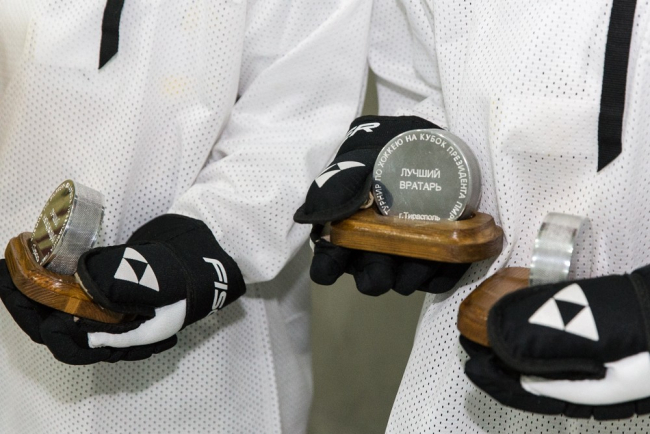 Хоккеистов приветствовал Глава государства. Президент отметил высокую организацию соревнований, поблагодарил за зрелищную игру, эмоции и вручил Кубок капитану команды «Тирасполь».