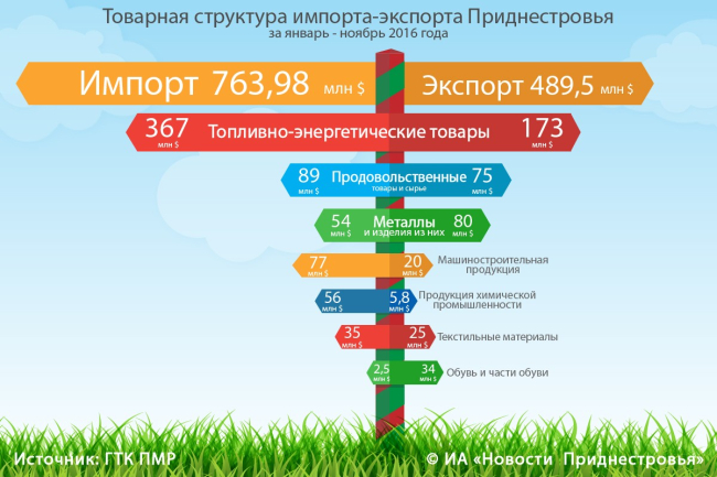 764 миллиона долларов в структуре оборота приходится на импорт, 489 миллионов — на экспорт. Если опять же сравнивать с минувшим годом, то импорт в нашу республику сократился более чем на 26%, а экспорт из ПМР — на 13%.