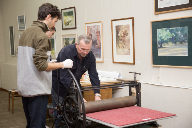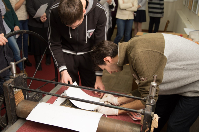Сегодня художник продемонстрировал учащимся Бендерского педагогического колледжа и Теоретического лицея работу печатного станка, печатающего линогравюру в цвете.