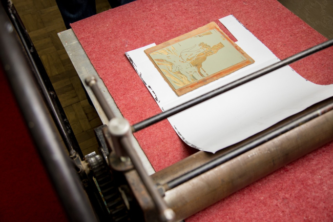При печати применяют типографские краски. Как рассказал Сергей Панов, накатывать краску на линолеум лучше всего получается вальцмассовым валиком, при этом важно отрегулировать количество краски, наносимой на линогравюру: её не должно быть много, чтобы не залить мелкий штрих, и не должно быть мало, чтобы не возникли непропечатки.
